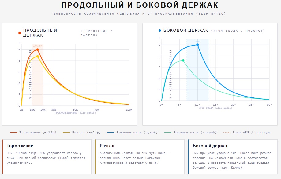 Это свойство шины было известно еще в 40-50 годах прошлого века, но Ганс Пачейка создал математический инструмент для его описания, который применяется и по сей день и называется Magic Formula. На мотоцикле максимальный держак появляется когда шина имеет 10-15% проскальзывания в продольном направлении и 6-8% в боковом. На мокром покрытии пики наступают гораздо раньше.